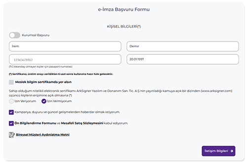 Açılan ekranda T.C. Kimlik Numaranızı, Adınızı, Soyadınızı, Doğum Tarihinizi boşluksuz olarak girin. Mesleki Bilgim Sertifikamda Yer Alsın Kısmını Boş, Hemen altındaki kısmı İZİN VERMİYORUM diye işaretleyip, üyelik ve gizlilik sözleşmesini doldurarak İletişim Bilgileri bölümüne tıklayınız.