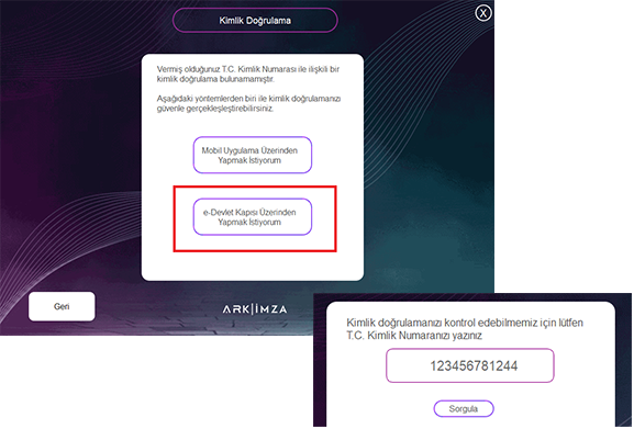 Açılan ekranda Kurulum Tipi Kısmından, E-DEVLET ÜZERİNDEN YAPMAK İSTİYORUM seçeneğini seçerek, açılacak olan T.C. Kimlik Numarası sorgulama ekranından kimlik numaranızı yazarak SORGULA diyiniz.